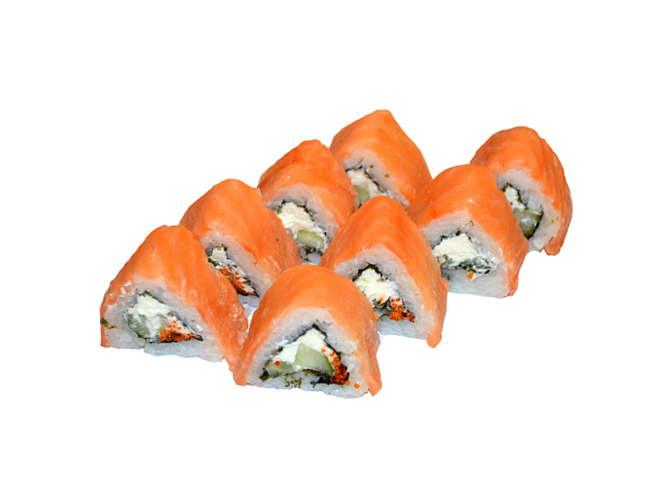 Попробуй ролл с начинкой из лосося, свежего огурца, творожного сыра, риса, авокадо, нори, панировка